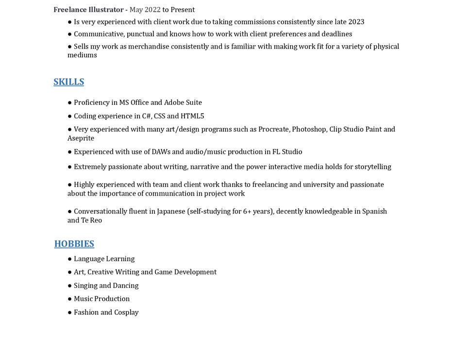 My name is Min Jordan, and I am a queer indie game developer and illustrator from Aotearoa.I've been making games solo for three years now, and have so far finished seven games with varying degrees of complexity (and varying amounts of crunch O_O)You can check my games out on my itch page here! (At the moment I have a soft spot for my cutesy cultist RPG 'Nim's Sin Removal Service')If you would prefer to see a short video snapshot of my work, check out my highlight reel here!I am currently in my last year of my Bachelor of Fine Arts at Massey University, and digital illustration is one of my biggest loves in life. I carry my iPad pretty much everywhere to sketch and work on creative projects!I also enjoy creative writing, dance, and also language learning in my spare time (I am conversationally fluent in Japanese, and can understand Spanish and Te Reo).My gamedev fire comes from my extreme passion around storytelling and the power narrative holds to make us feel seen. Just like how modern indie classics such as ‘Undertale’, ‘Night In The Woods’, and ‘OMORI’ have affected me and my worldview deeply with their worlds and stories, I am passionate about using the immersive and interactive capabilities of videogames to make works that can make others feel less alone in their mental struggles and life experiences.I hope you enjoy my work! :)