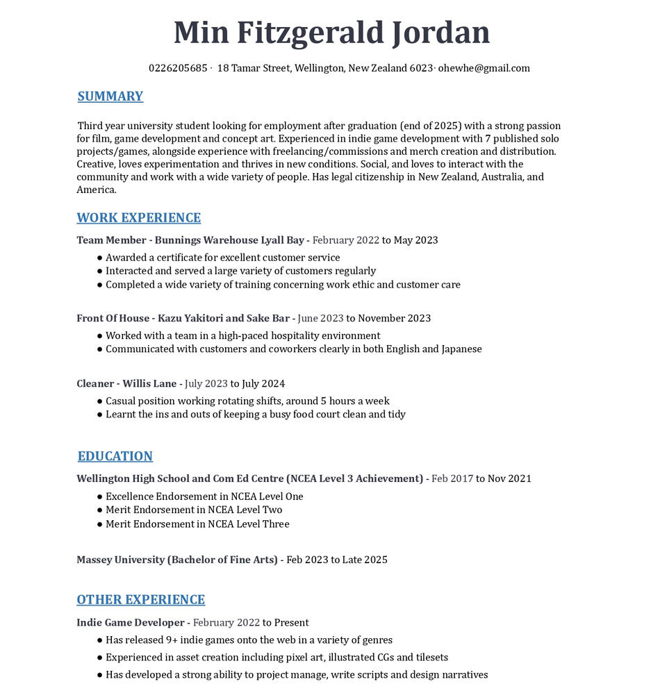 My name is Min Jordan, and I am a queer indie game developer and illustrator from Aotearoa.I've been making games solo for three years now, and have so far finished seven games with varying degrees of complexity (and varying amounts of crunch O_O)You can check my games out on my itch page here! (At the moment I have a soft spot for my cutesy cultist RPG 'Nim's Sin Removal Service')If you would prefer to see a short video snapshot of my work, check out my highlight reel here!I am currently in my last year of my Bachelor of Fine Arts at Massey University, and digital illustration is one of my biggest loves in life. I carry my iPad pretty much everywhere to sketch and work on creative projects!I also enjoy creative writing, dance, and also language learning in my spare time (I am conversationally fluent in Japanese, and can understand Spanish and Te Reo).My gamedev fire comes from my extreme passion around storytelling and the power narrative holds to make us feel seen. Just like how modern indie classics such as ‘Undertale’, ‘Night In The Woods’, and ‘OMORI’ have affected me and my worldview deeply with their worlds and stories, I am passionate about using the immersive and interactive capabilities of videogames to make works that can make others feel less alone in their mental struggles and life experiences.I hope you enjoy my work! :)